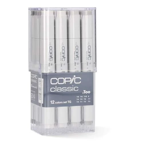 This Copic Classic Marker 12 TG (Toner Grey) Set is presented in a practical acrylic display case and contains 11 shades of grey + black. The markers all have both wide and fine polyester tips.