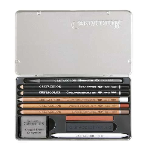 This Cretacolor Artino Sketching Set is a 10-piece drawing set in the best artist quality, presented in a sturdy metal case.
