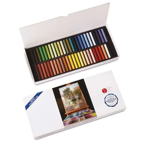 The Girault Extra Fine Pastel 50 Shade Assortments are presented in cardboard boxes with cushioned foam inserts to hold the individual pastels.