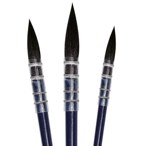 I Love Art Classic Watercolour Wash Brushes have short blue lacquered handles. The tips have fine round points and are bound with real feather quills. These are good quality brushes which represent unbeatable value for money.