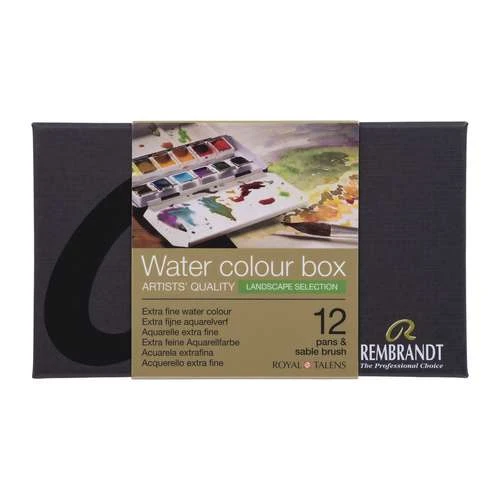 The metal watercolour box is presented in a beautiful cardboard case. It contains 12 pans of this popular artist’s watercolour paint by Rembrandt, plus a removable mixing palette and a high-quality red sable hair watercolour brush.