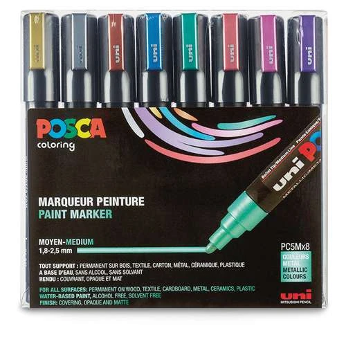 This Uni Posca PC5M Marker Metallic Set contains 8 PC5M markers which are ideal for writing and drawing on all surfaces. They are perfect for illustrators and graphic artists, for professionals and hobby artists alike.