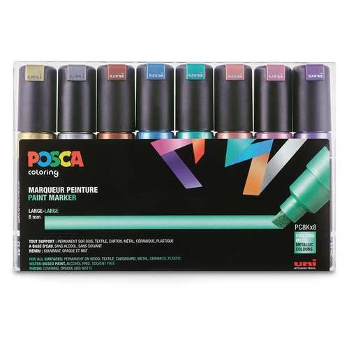 The Uni Posca PC8K Marker Metallic Set contains the following colours: gold, silver, bronze, metallic green, metallic violet, metallic red, metallic pink, metallic blue. The chisel tips are 8mm wide