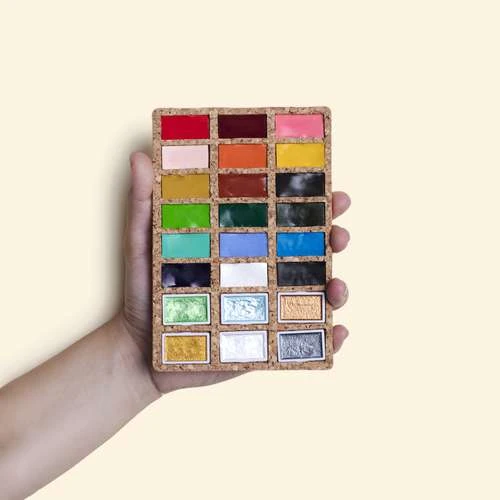 TIP: These watercolours are not in plastic cups in a tin but directly in a box made of recycled wine corks. This is not only environmentally friendly, it is also practical. Because this way, your paints are well protected when you work on the go. Moreover, it feels nice and looks cool!